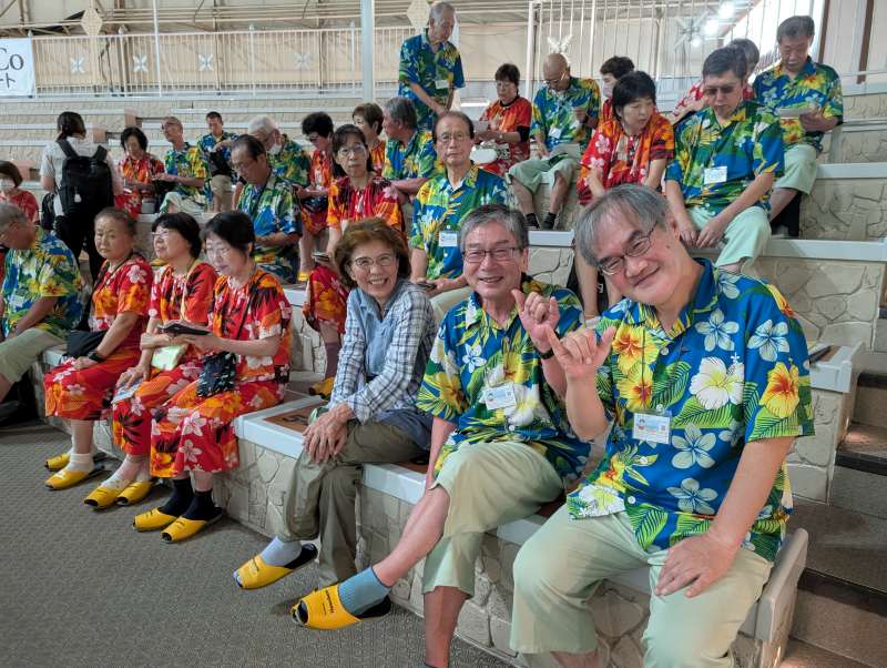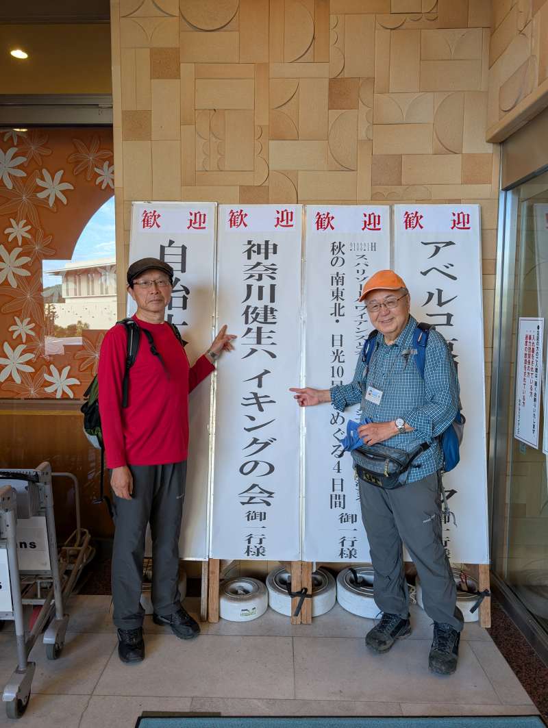 初日は横浜駅から直通バスで約4時間、スパリゾートハワイアンズに到着しました。ホテル玄関には「神奈川健生ハイキングの会御一行様」と書かれた歓迎看板が立てられ、参加者の気分も高まりました。夕方からは宴会場で和やかな夕食。色とりどりのハワイアン柄の館内着に着替え、和気あいあいとした雰囲気で杯を交わしました。