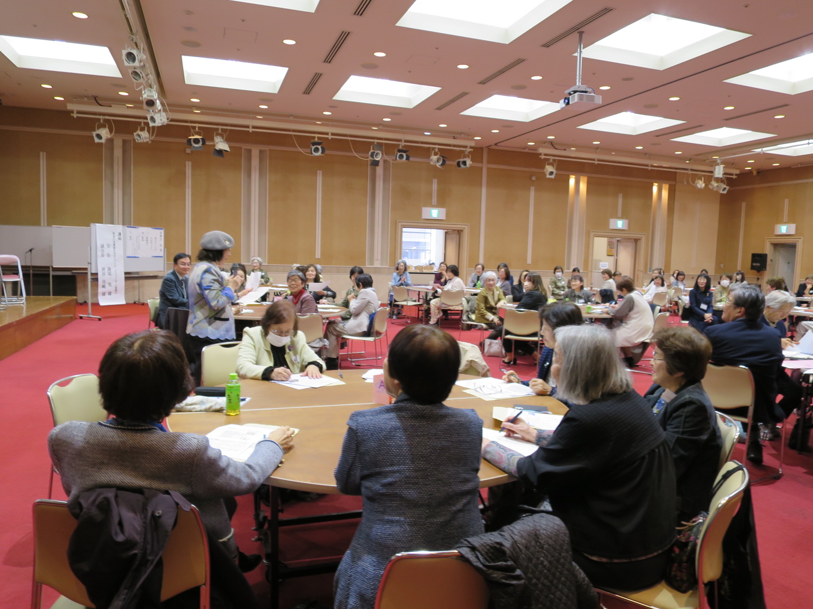 今回の研修は参加型で、ペアワーク・グループワークの時間を設けました。参加された先生方は13の丸テーブルに年代別に座り、各テーブルにファシリテーターが入りました。 ファシリテーターは退職女性校長会の運営スタッフだけでは足りず、神奈川健生会員も7名加わりました。 ただ、元校長先生の集まりだけあって、上手に意見交換が進み、ファシリテーターが要らないようなグループもありました。